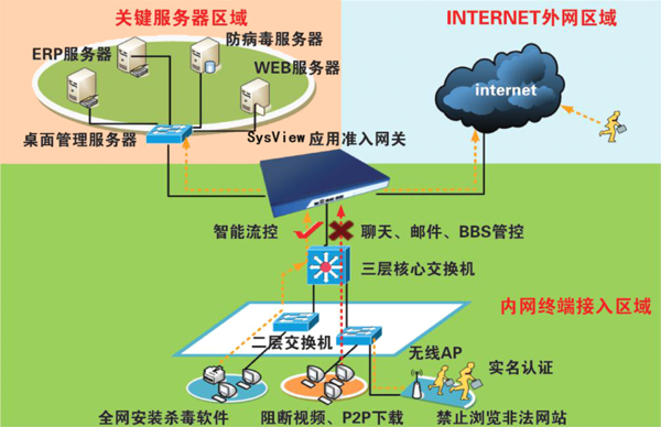 SysView应用准入网关同时具备上网实名认证、智能网络流量控制、网络应用协议过滤(聊天工具帐号/邮件发送帐号审计、BBS发贴控制、URL网址过滤)、IPSEC/SSL VPN、防火墙等功能,严格控制了内网用户的网络行为,解决终端的随意访问外网、内部应用系统的访问控制,以及病毒泛滥等安全问题。